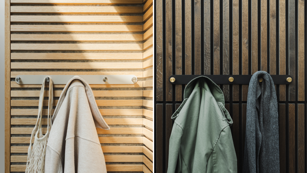 Minimalistyczny, modułowy wieszak, który montujesz bezpośrednio na swoich panelach Akupanel.