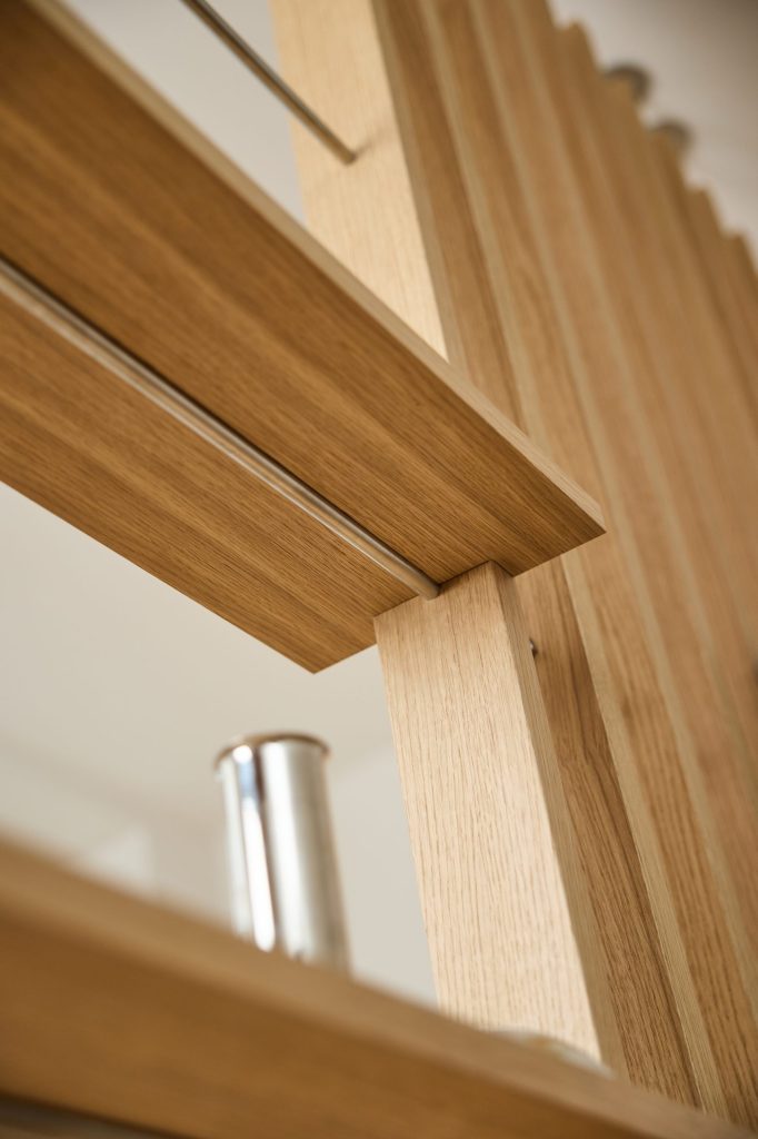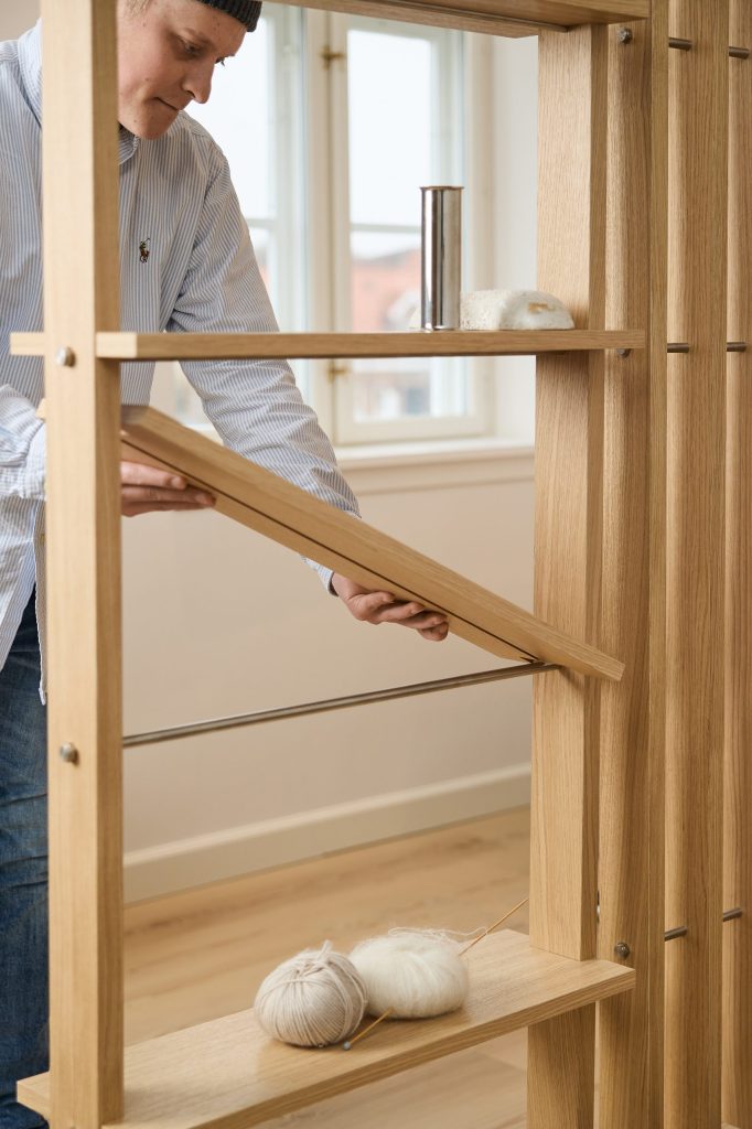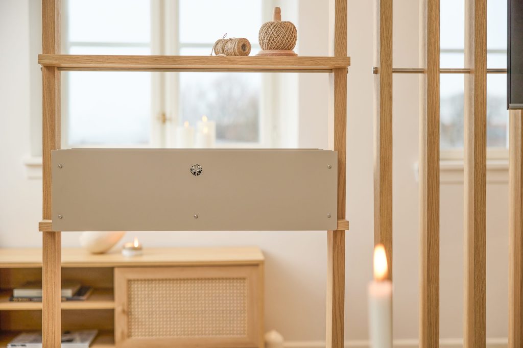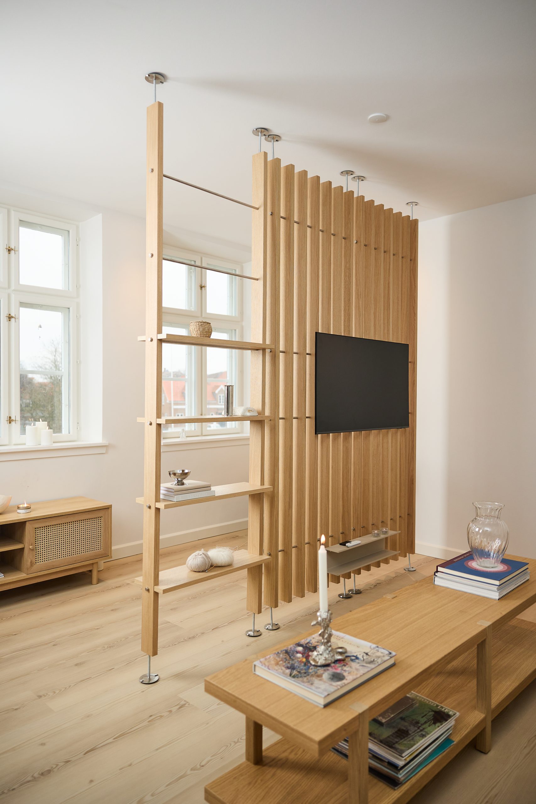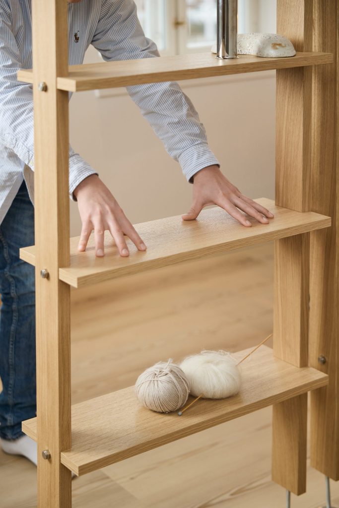 Dębowa półka dodaje ciepła i pomaga wprowadzić spokojniejszy klimat do pokoju. Naturalne drewno zmiękcza wygląd dzielnika pokoju i dodaje zrównoważonego, skandynawskiego klimatu.