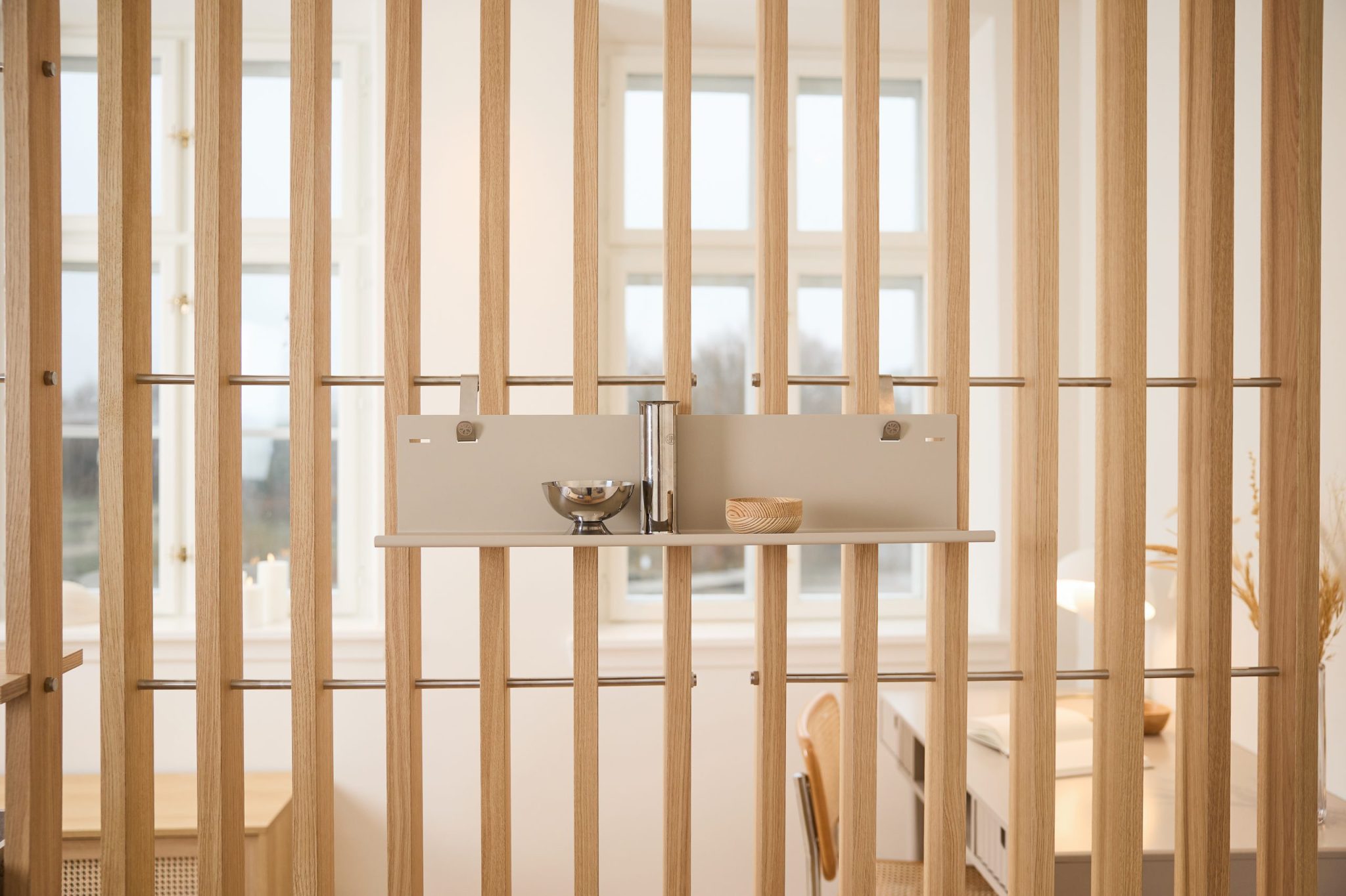 Nell Metal Shelf to pojedyncza, otwarta półka stworzona specjalnie dla Embrace | BM1. Daje łatwe miejsce na dekoracje i codzienne przedmioty, nie obciążając wyglądu.