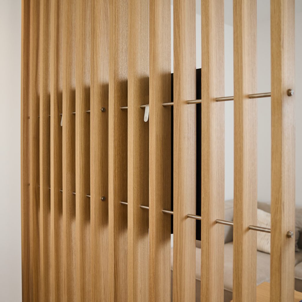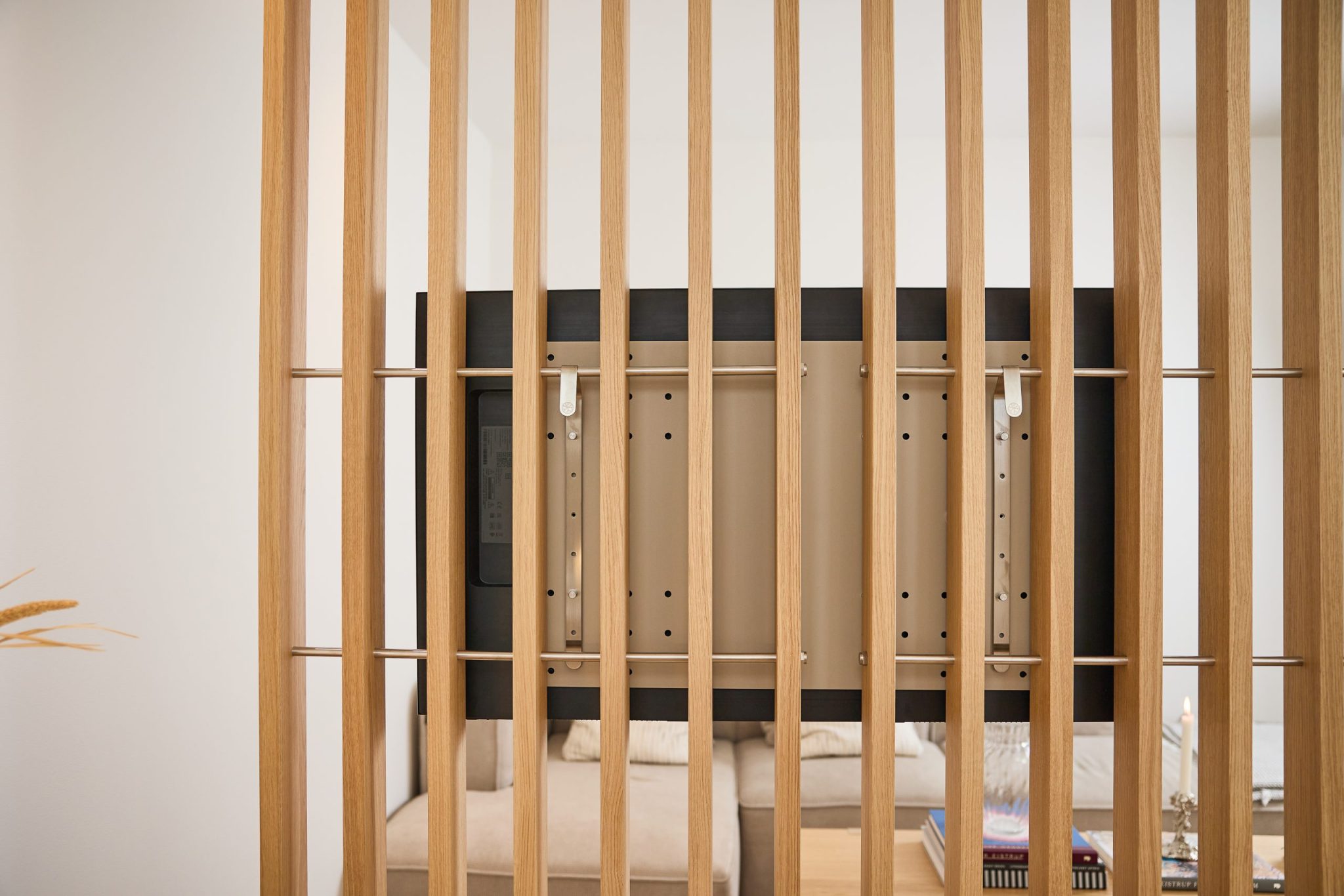Nell TV Mount jest stworzony wyłącznie dla Embrace | BM1. Montuje się go bezpośrednio na systemie, dzięki czemu telewizor staje się częścią BM1, a nie czymś przymocowanym do ściany. Daje to swobodę umiejscowienia ekranu tam, gdzie najlepiej pasuje do Twojego miejsca siedzącego i sposobu korzystania z pokoju. Nie jesteś ograniczony do jednego układu — możesz dostosować lub przenieść telewizor, jeśli coś się zmieni, nie sprawiając, że aranżacja będzie ciężka lub trwała.