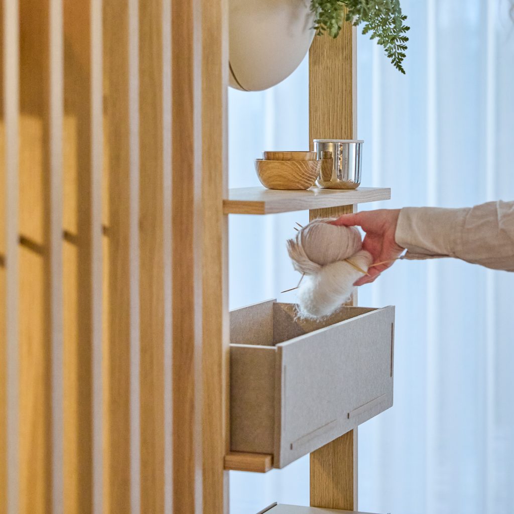 Pasuje do Lova Wood Shelf — Po złożeniu, po prostu umieść Vigg na swojej 3707 Lova Wood Shelf, aby uzyskać natychmiastowo zorganizowane, miękkie rozwiązanie do przechowywania.