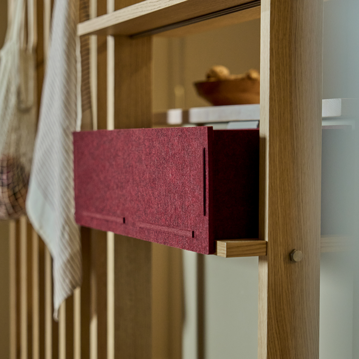 Vigg Felt Box jest zaprojektowany, aby idealnie pasować do Lova Wood Shelf. Rozmiar, miękki filc i czyste krawędzie naturalnie leżą na półce — przekształcając otwarte przechowywanie w spokojną, zorganizowaną przestrzeń, w której łatwo się żyje.