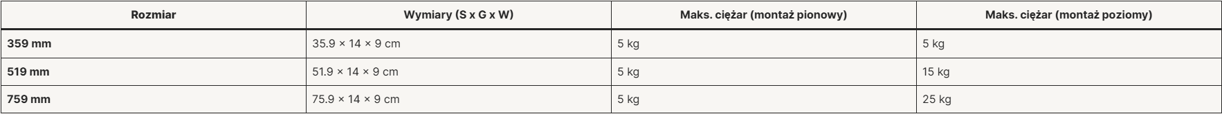 | Rozmiar | Wymiary (S x G x W) | Maks. ciężar (montaż pionowy) | Maks. ciężar (montaż poziomy) |